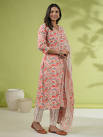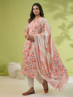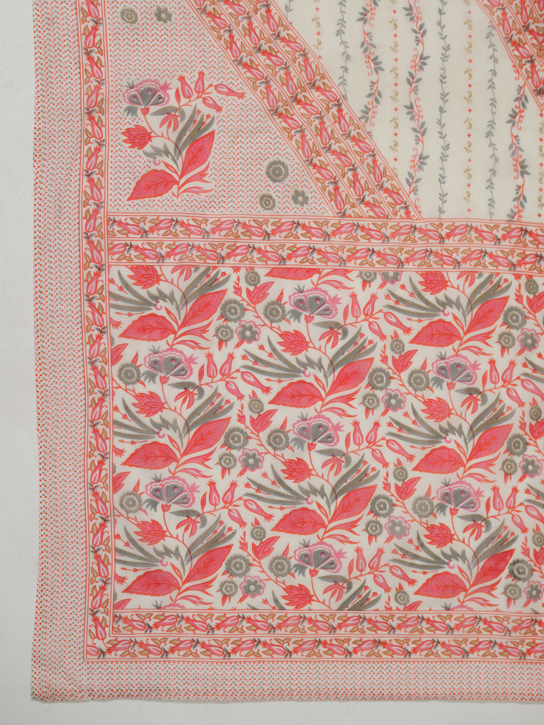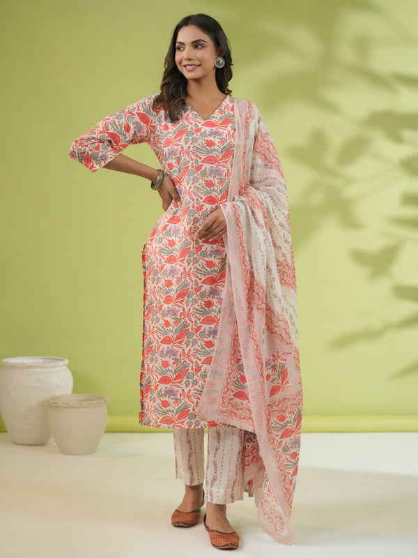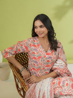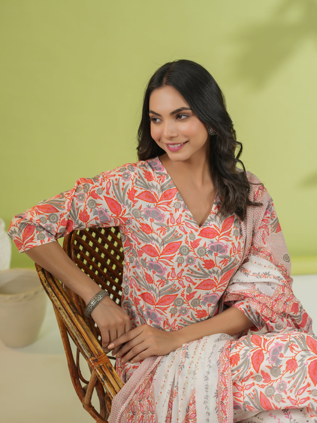 Janasya Straight Cambric Off White Floral V-Neck Set
