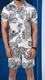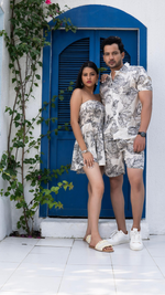 Get ready for a tropical vacation with this modal printed couple co-ord set / matching couple outfits. Made from soft modal satin fabric, the men's shirt and shorts set features a sleek black floral print, while the women's mini tiered smocked dress adds a touch of elegance. A perfect for resort wear collection or holiday fashion.