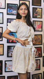 Get ready to turn heads with this off-shoulder top and skirt Co-Ord Set for Women. Made from a luxurious cotton lurex fabric, the elastic balloon sleeves and white and gold lurex stripes add a touch of glamour. Perfect Resort Wear for Women for a tropical getaway or vacation, this trendy women's fashion piece is a must-have addition to your wardrobe.