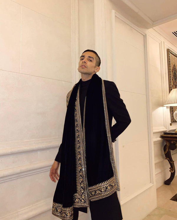 trueBrowns Black Velvet Embroidered Lace Shawl | Relove - Free Size