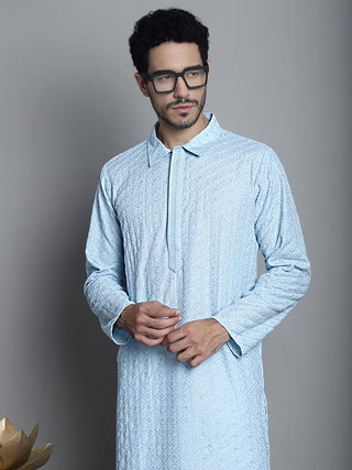Jompers Men's Chikankari Embroidered and Sequence Kurta with Pyjama - Sky BlueBrand Color : Sky