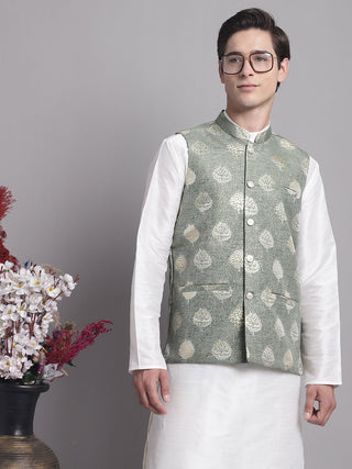 Jompers Men's Green and Golden Printed Nehru JacketBrand Color : Pista Collar Type : Mandarin Design/Pattern : Printed Sleeves Type : Sleeveless Wash Care and Material : Wash with mid detergent 70% Silk & 30% Cotton.Legal Disclaimer: Product color may slightly vary due to photographic lighting sources or your monitor settings.