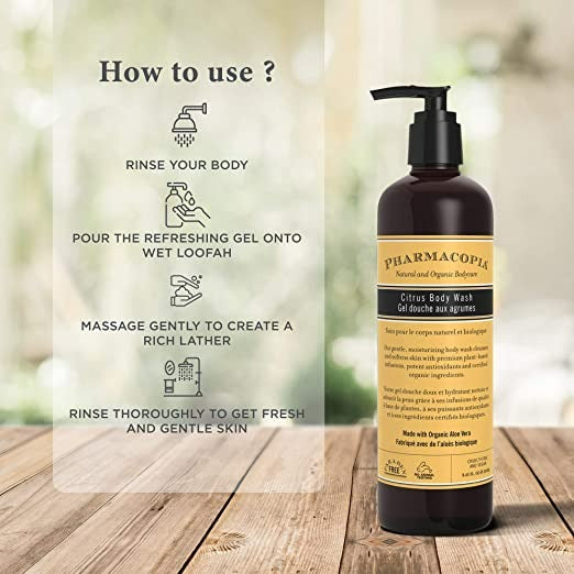• Pour the body wash onto wet loofah or palm, massage gently all over the wet body, and rinse thoroughly.