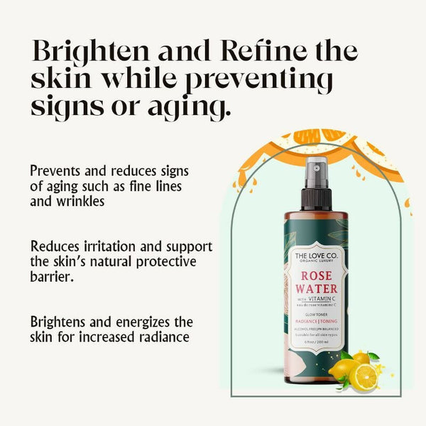 The Love Co. Rose Water Spray is natural rose water for skin, a daily toner for oily skin, a toner for dry skin, and a face mist for all skin types, including sensitive skin. Use as a daily refreshing toner for tightening pores on the face, treating blemishes, and revitalising "pick-me-up" spray.