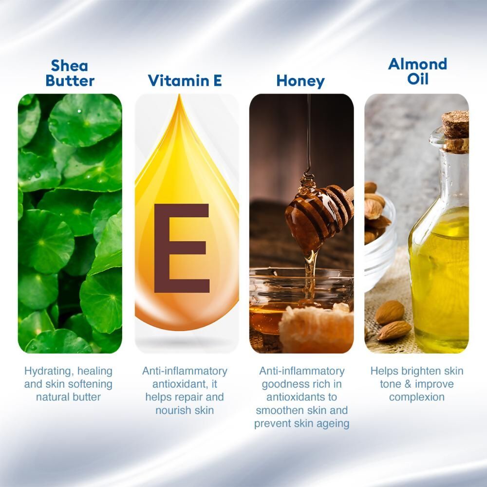 • Rich in anti-inflammatory properties, Shea Butter helps boost moisture levels and soothe and calm the skin. The moisturizer also contains Sweet Almond Oil which is rich in Vitamins, fatty acids, and antioxidants that help lighten scars and pigmentation and smoothen skin texture.