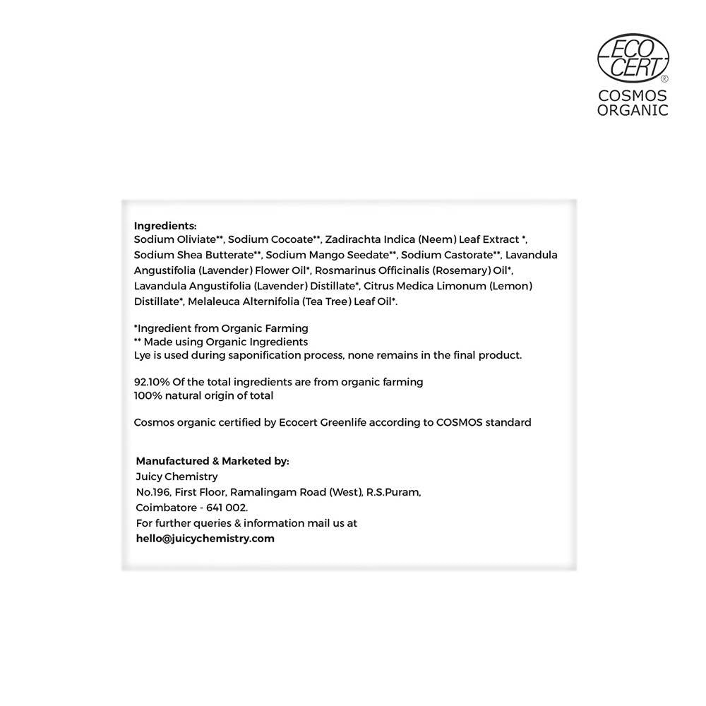 Juicy Chemistry Tea Tree, Neem & Rosemary for Anti-Bacterial Hand & Body Bar: 90 gmDetoxifies skin: This intensive soap bar has hydrating b...
