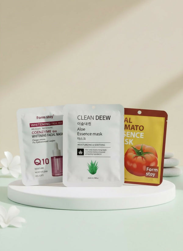 • Unveil visibly smoother, brighter skin with the Form Stay & Clean Deew Facial Mask. This set includes Whitening Mask for delicate brightening and anti-aging, Aloe Essence Mask for deep moisturizing and soothing, and Real Tomato Essence Mask for intense nourishment and hydration. Each mask is packed with natural extracts and powerful whitening ingredients, designed to target dryness, uneven tone, and tired-looking skin. Suitable for all skin types, these masks provide spa-quality results at home, helping you achieve a healthy, radiant complexion with every use.