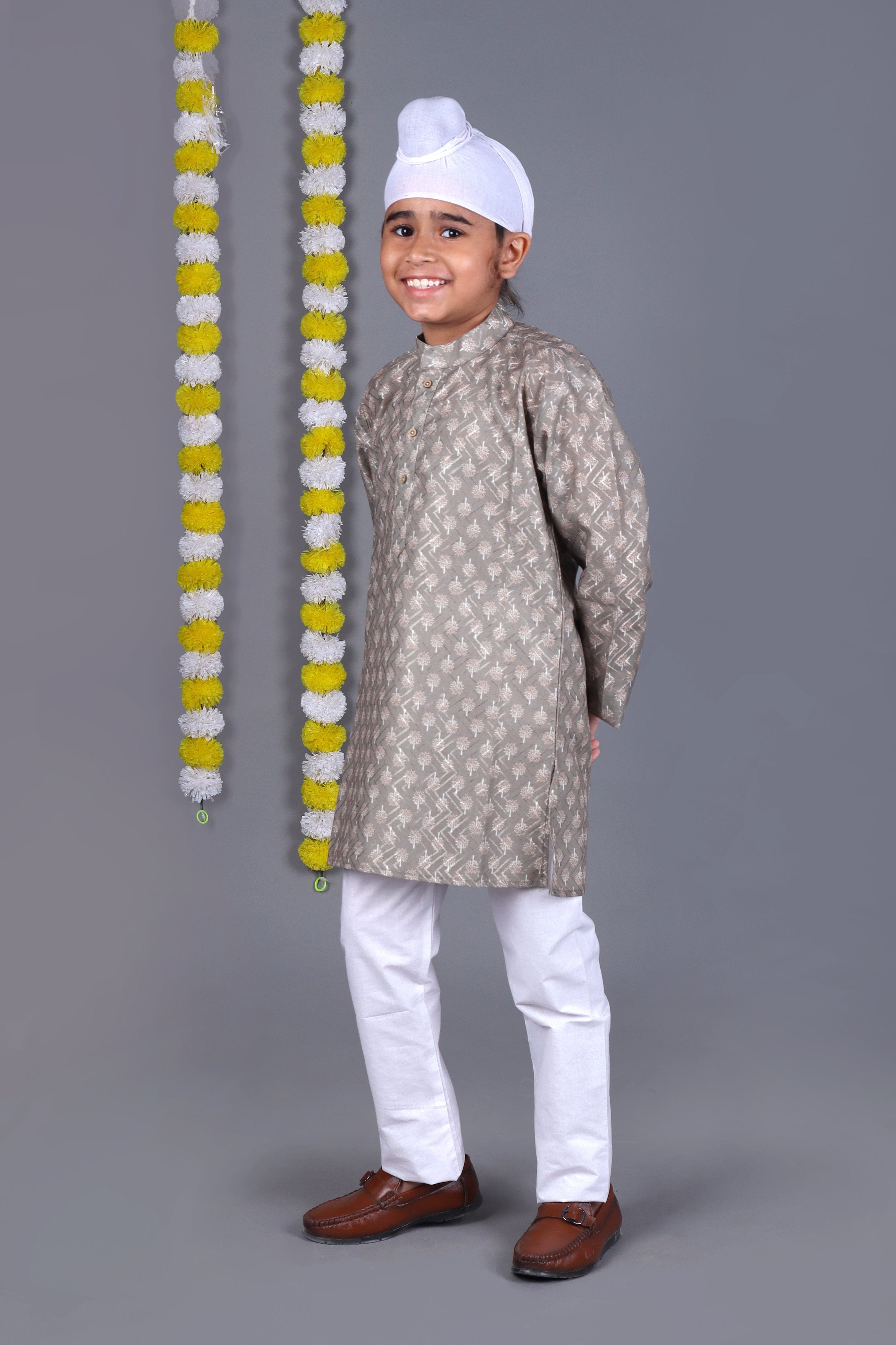 Elevate your child’s festive look with this stunning Grey Printed Kurta Set by Veshbhoshaa. Crafted with elegance and comfort, this set combines traditional craftsmanship with a modern twist. The beautiful Grey color makes it the perfect choice for weddings, festivals, and special family events. Let your little one shine in this timeless and fashionable piece!