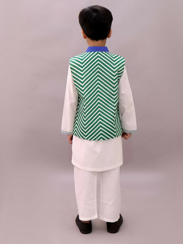 Lil Drama Shor-Gul White Kurta Pyjama with Green Jacket Set For Boys