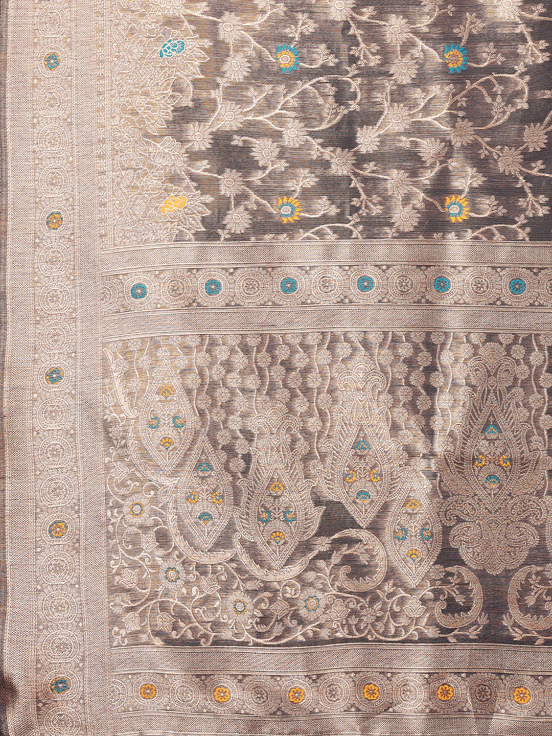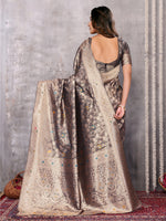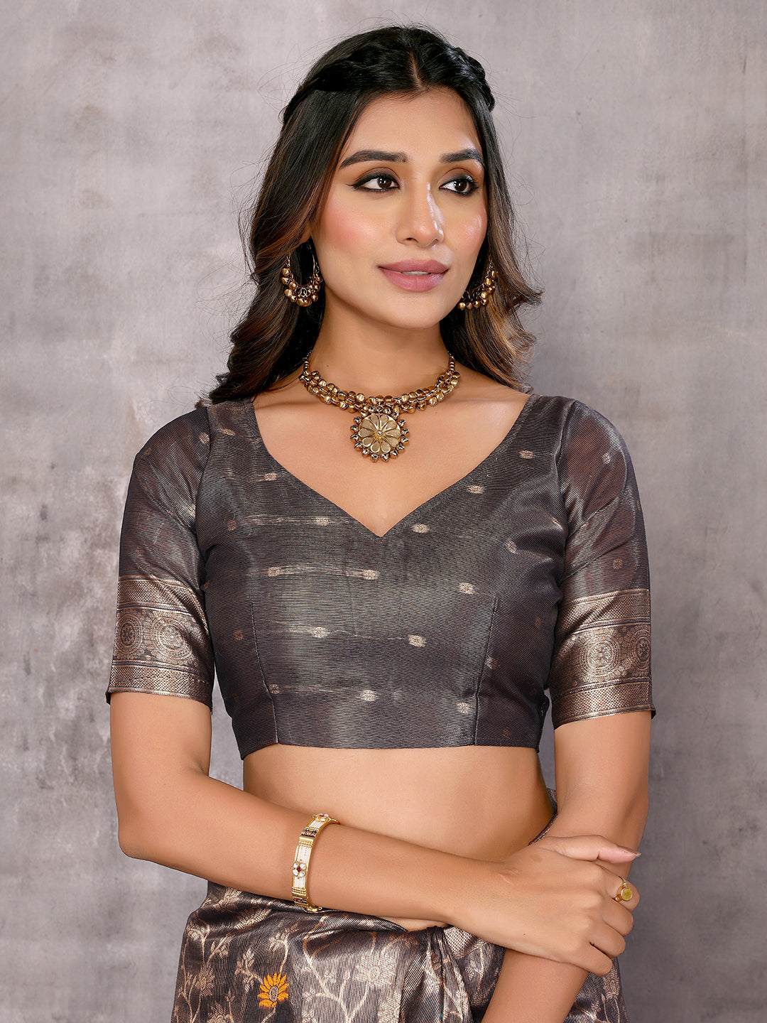 Janasya Blue & Gold Silk Blend Floral Banarasi Saree