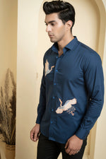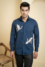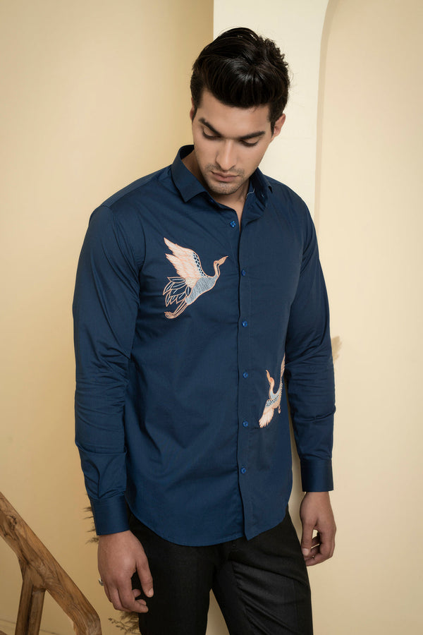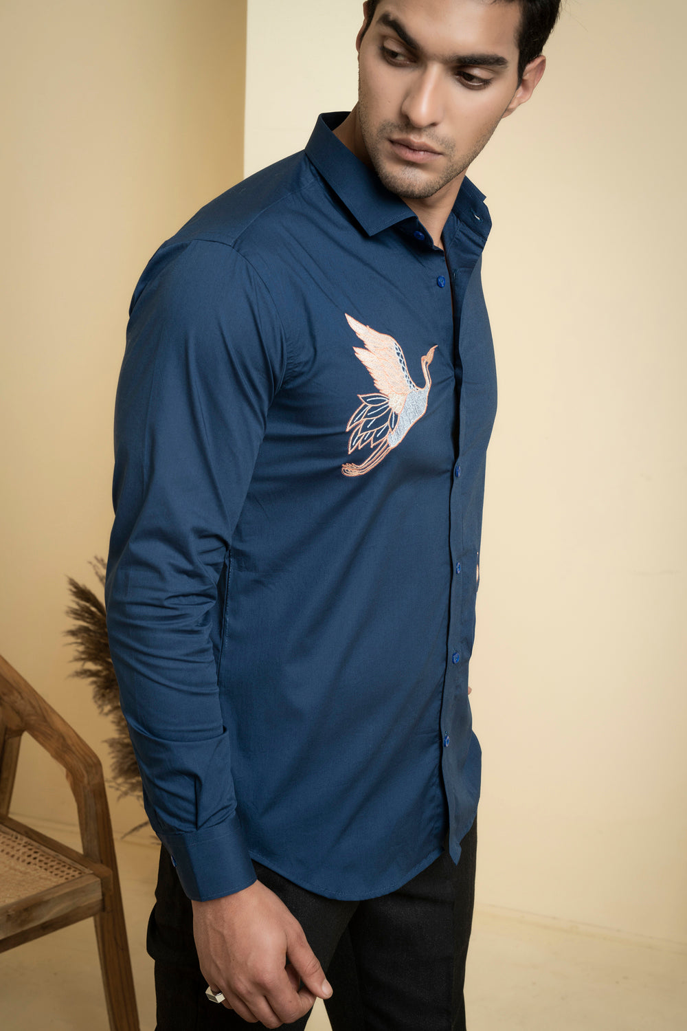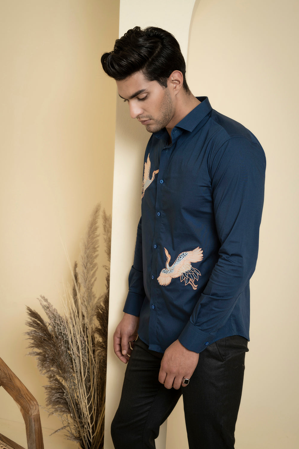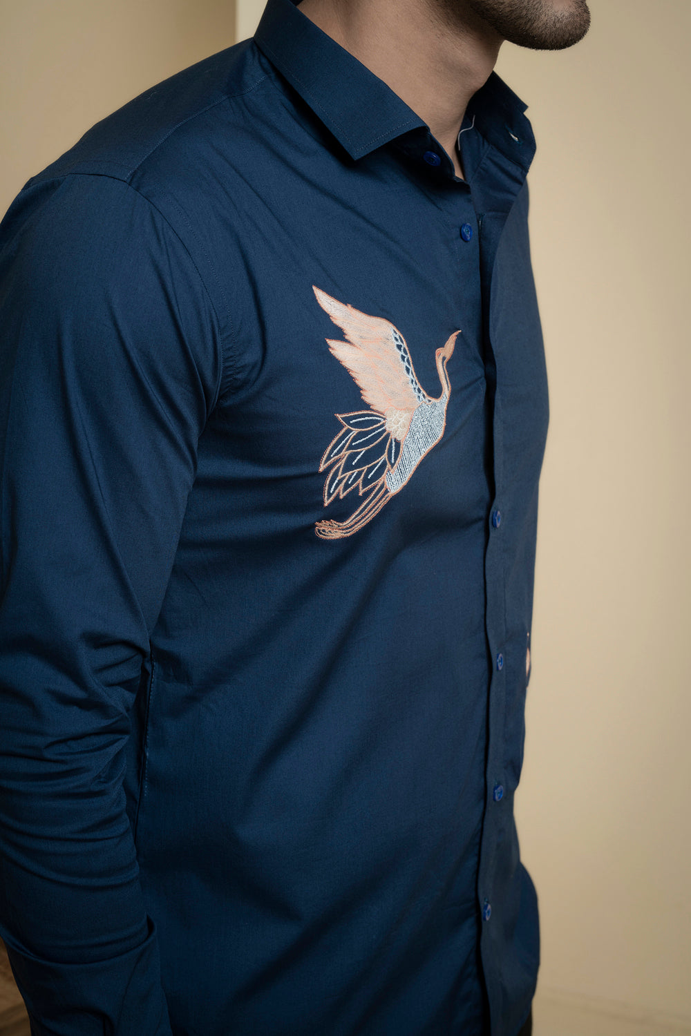 This blue shirt is made of poplin lycra fabric and features two cranes embroidered on the left bottom and right chest region. The intricate embroidery adds a touch of elegance to the shirt, making it perfect for both casual and formal occasions. The poplin lycra fabric offers a comfortable and breathable fit, making it a great choice for warm weather. The shirt is versatile and can be dressed up or down, making it a must-have in any wardrobe.