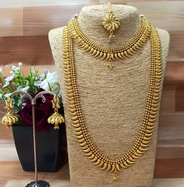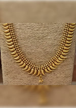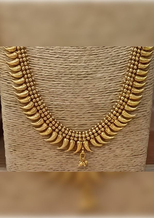 Embrace the elegance of South Indian tradition with this exquisite gold-plated Kerala Mullamottu Mala set. This stunning jewelry ensemble features a classic long necklace, a complementary short necklace, and matching jhumka earrings, perfect for weddings, festivals, and special occasions.