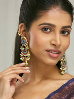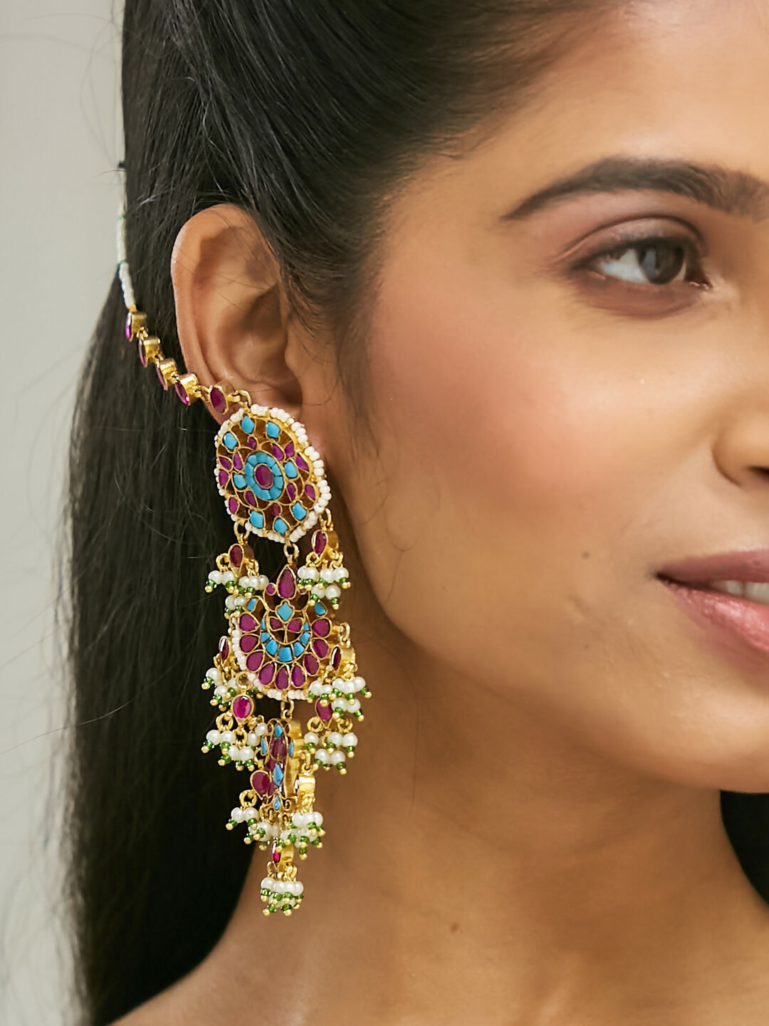 Nuyug 22K Gold-Plated Kundan Studded & Pearl Beaded Crescent Shaped Kanauti EarringsAbout the product:22K Gold-plated, pink & blue, white c...