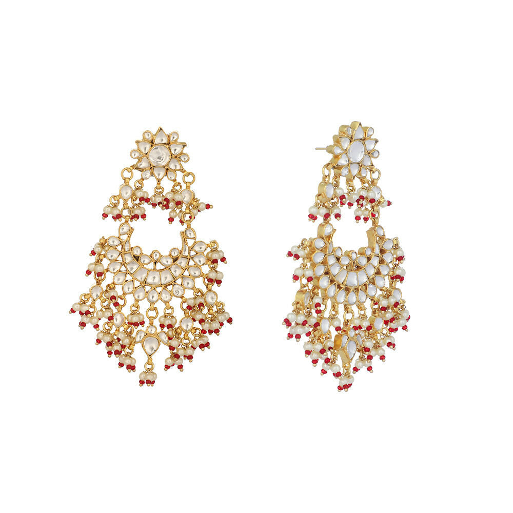 22 k Gold-toned, white pearls and red beads crescent shaped chandbalis, gold-plated, has kundan studded and beaded details. Secured with a post and back closure. This comes with 1 year plating warranty, anti-tarnish and hypoallergenic for lasting shine and comfort.