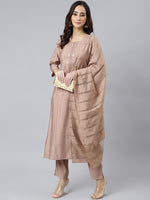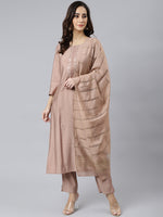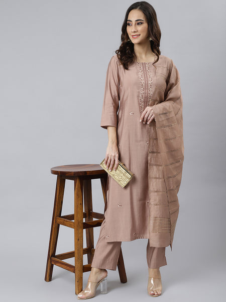 Amp up your fashion quotient with this dusty rose embroidered kurta set. The kurta is crafted in viscose blend fabric and comes with delicate embroidery, a round neck, and quarter sleeves and the pant is designed in the same fabric with straight cut silhouette. It is paired with silk dupatta that has woven detailing in golden color.