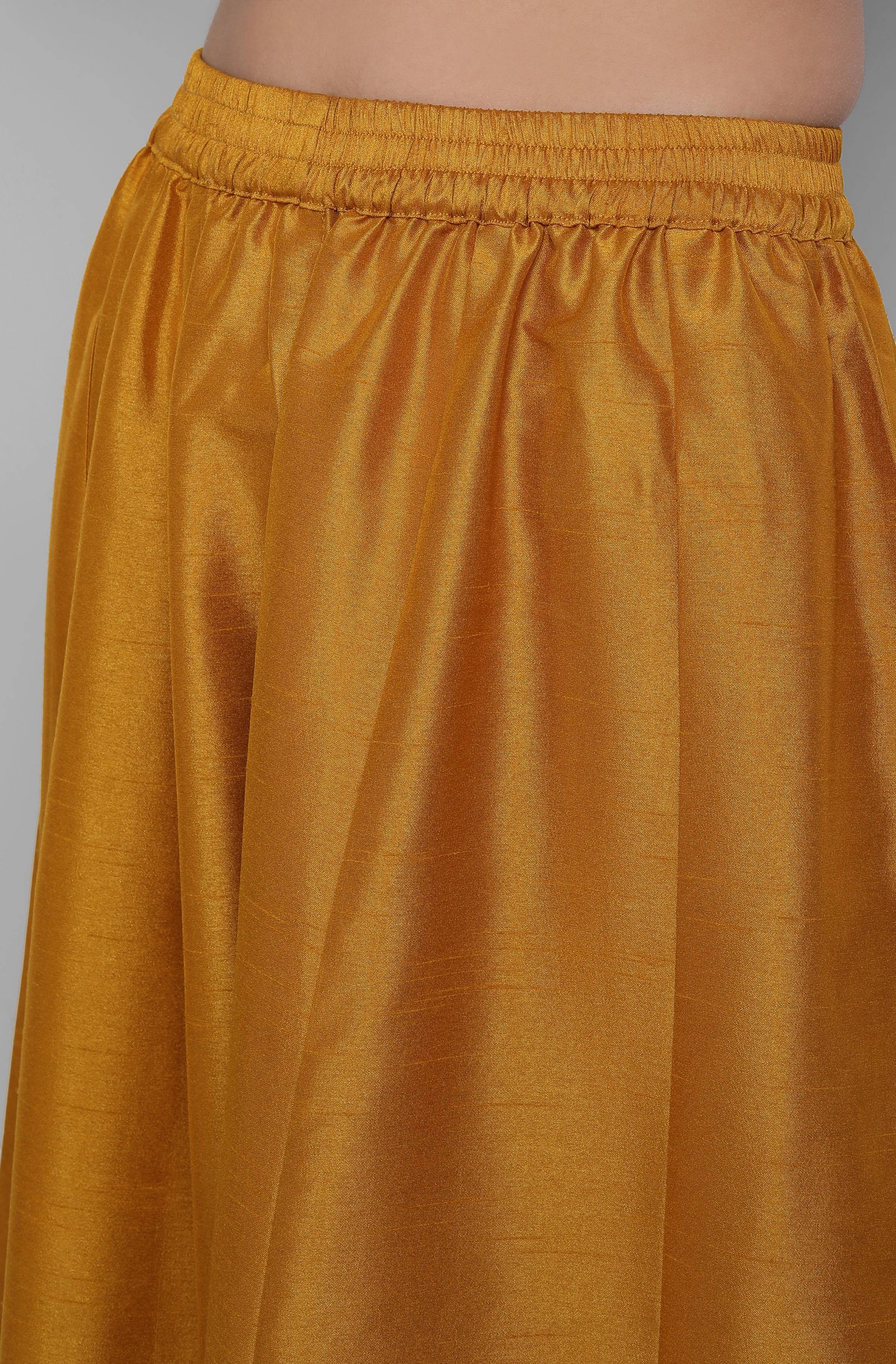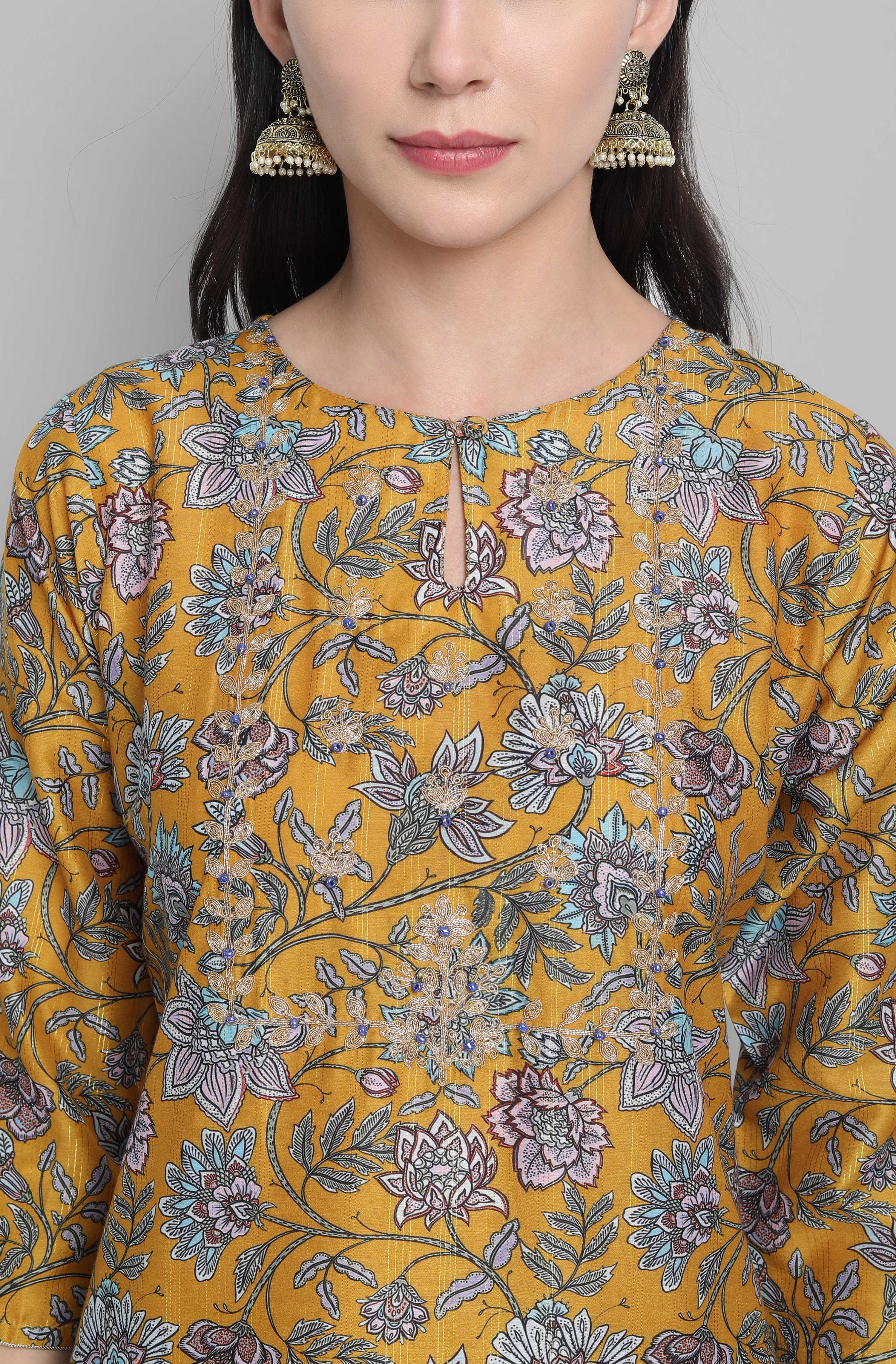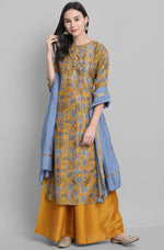 Janasya Women's Mustard Poly Muslin Embroidered Kurta With Palazzo And Dupatta Made in poly muslin, the digital print kurta is embellished with d...