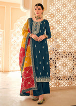 Dazzling Teal Embroidered Chinnon Palazzo Salwar Kurta - Emponline