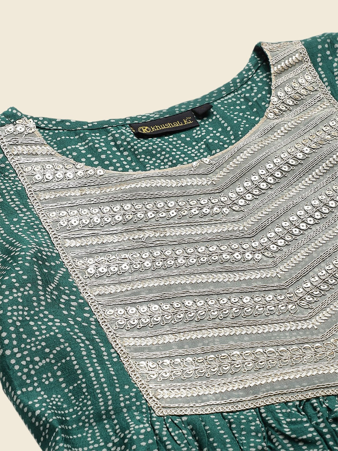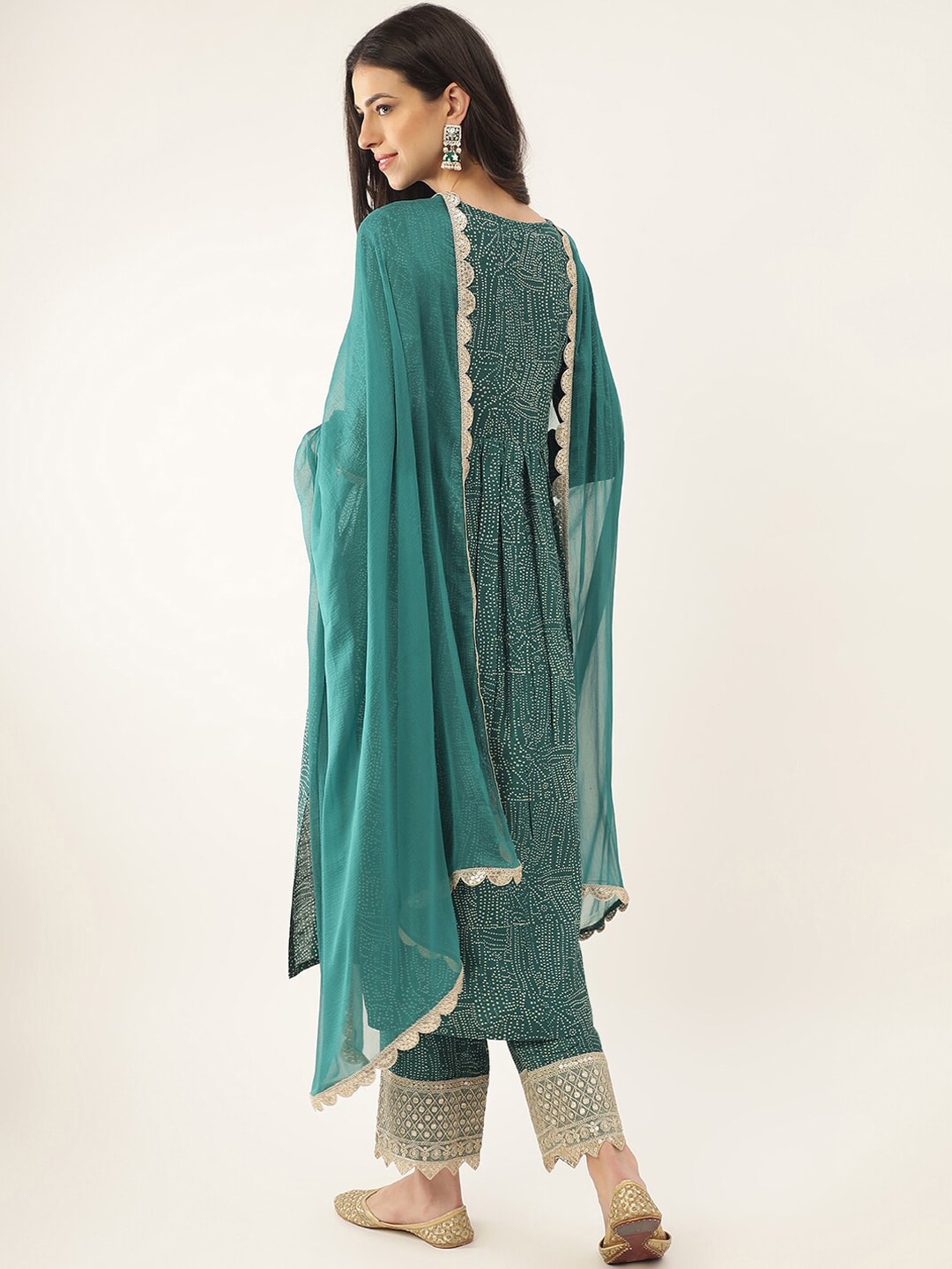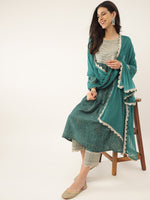 Khushal K Ethnic Motifs Printed Sequinned A-Line Kurta With Palazzos & Dupatta Product Details Green & grey printed Kurta with Trousers ...