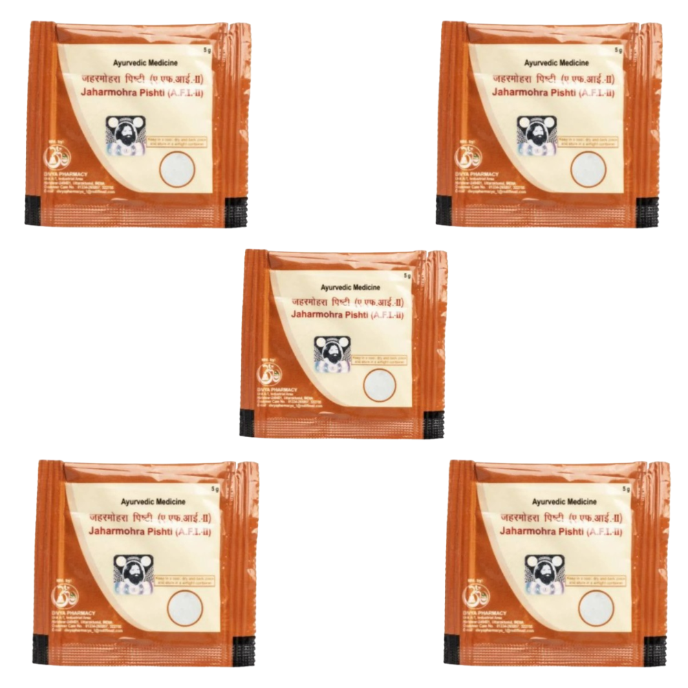 Divya Jaharmohra Pishti contains Jaharmohra and Gulab Jal as main ingredients.