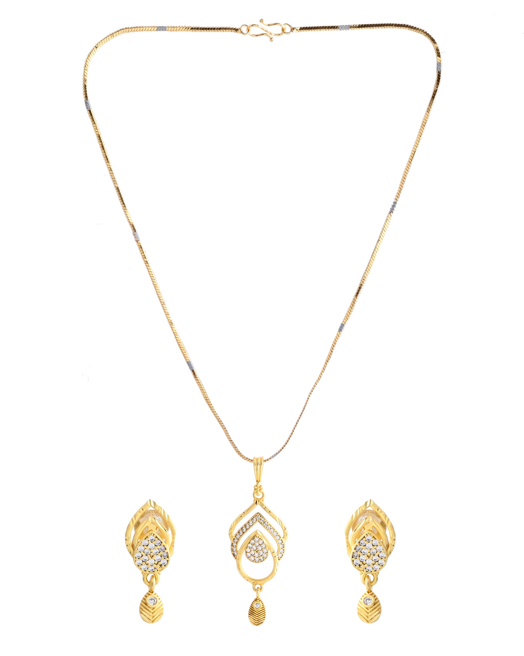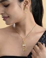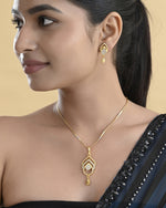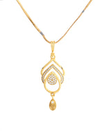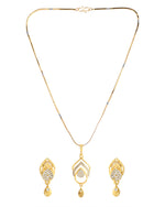 Elevate your elegance with this Gold Plated AD Stone Studded Designer Chain Set. Crafted with precision, it features shimmering AD stones that add a touch of luxury to your look. The intricate design and rich gold plating make it a perfect accessory for weddings, parties, or special occasions. A timeless piece for every jewelry collection.
