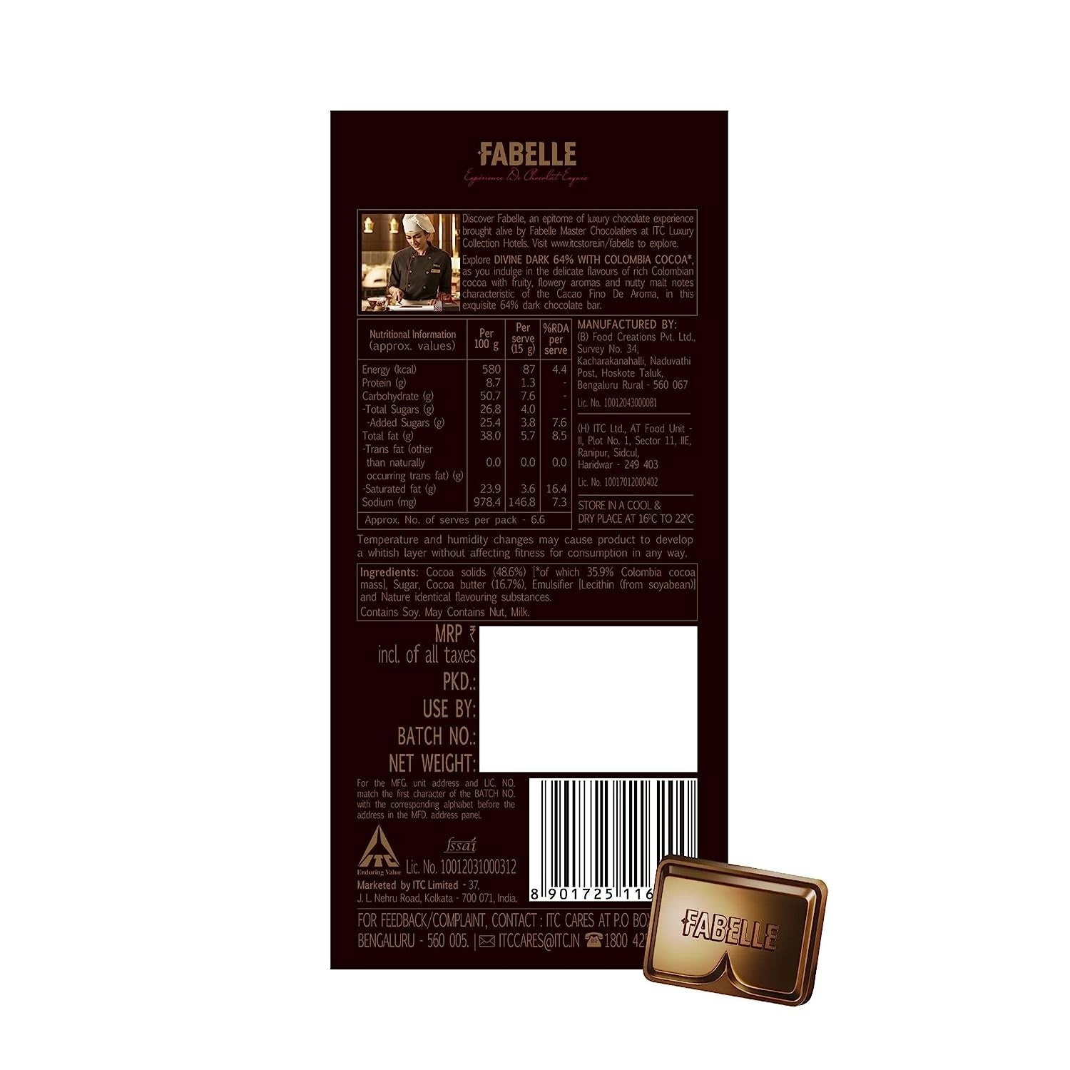 Fabelle Divine Dark 64% With Colombia Cocoa - Dark Chocolate Luxury Bar - 100 gm
