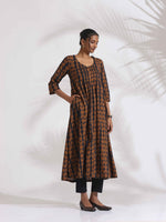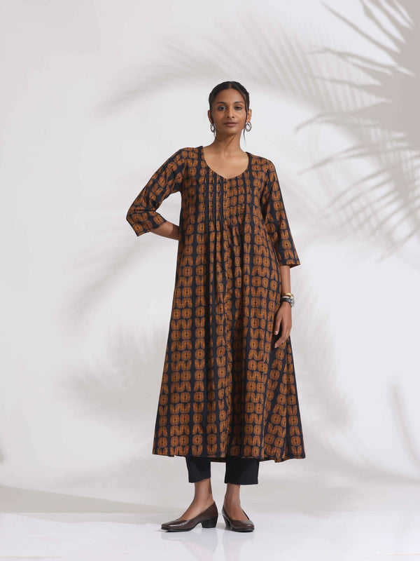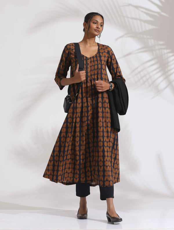 trueBrowns Black Cotton Print Pleated Flared Kurta Set - XS