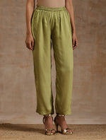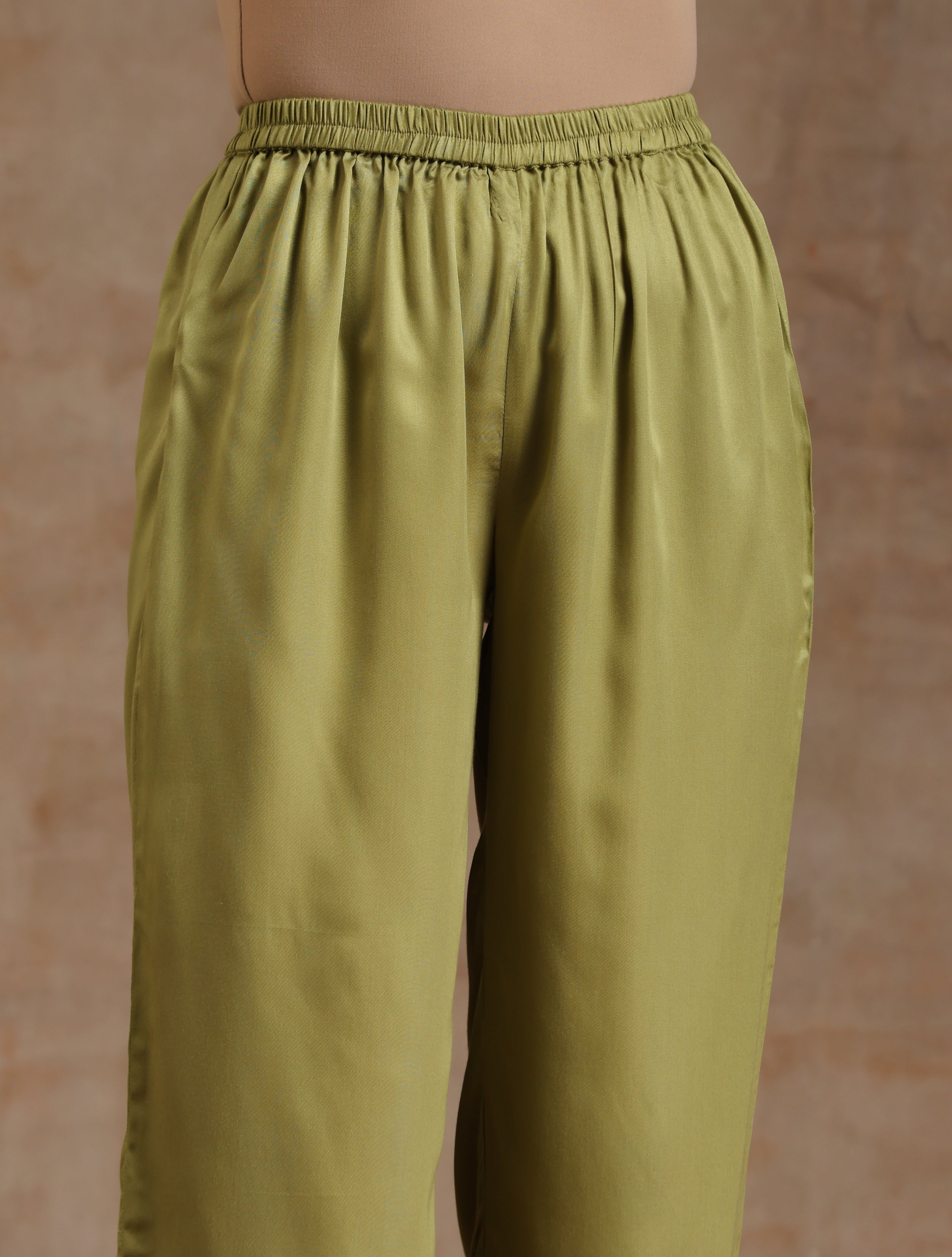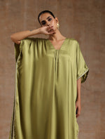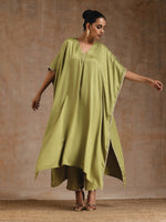 trueBrowns Light Green Modal Satin Kaftan Kurta SetDescription Modal satin kaftan kurta with neck gather and side lace details. Paired with elastic...