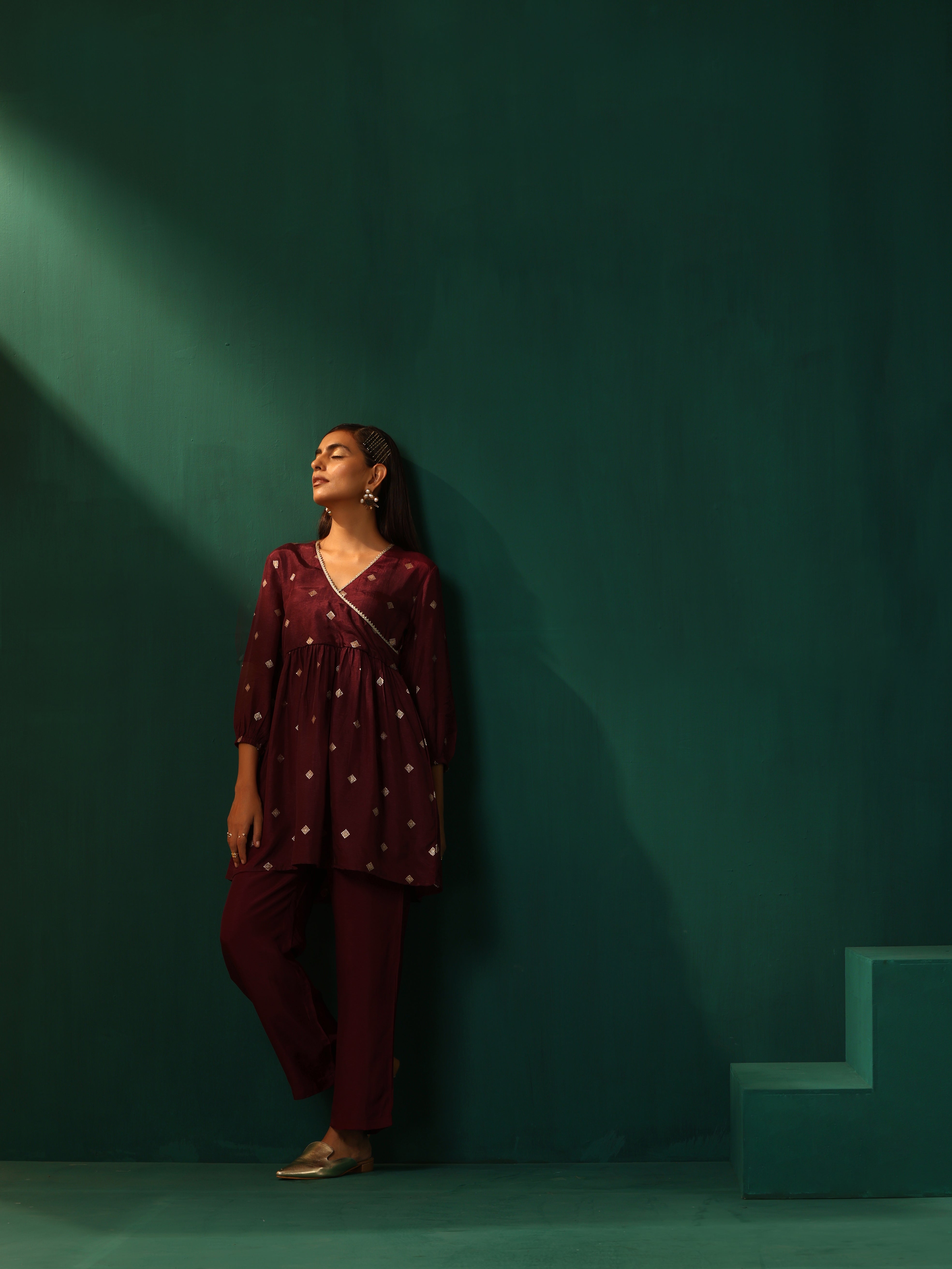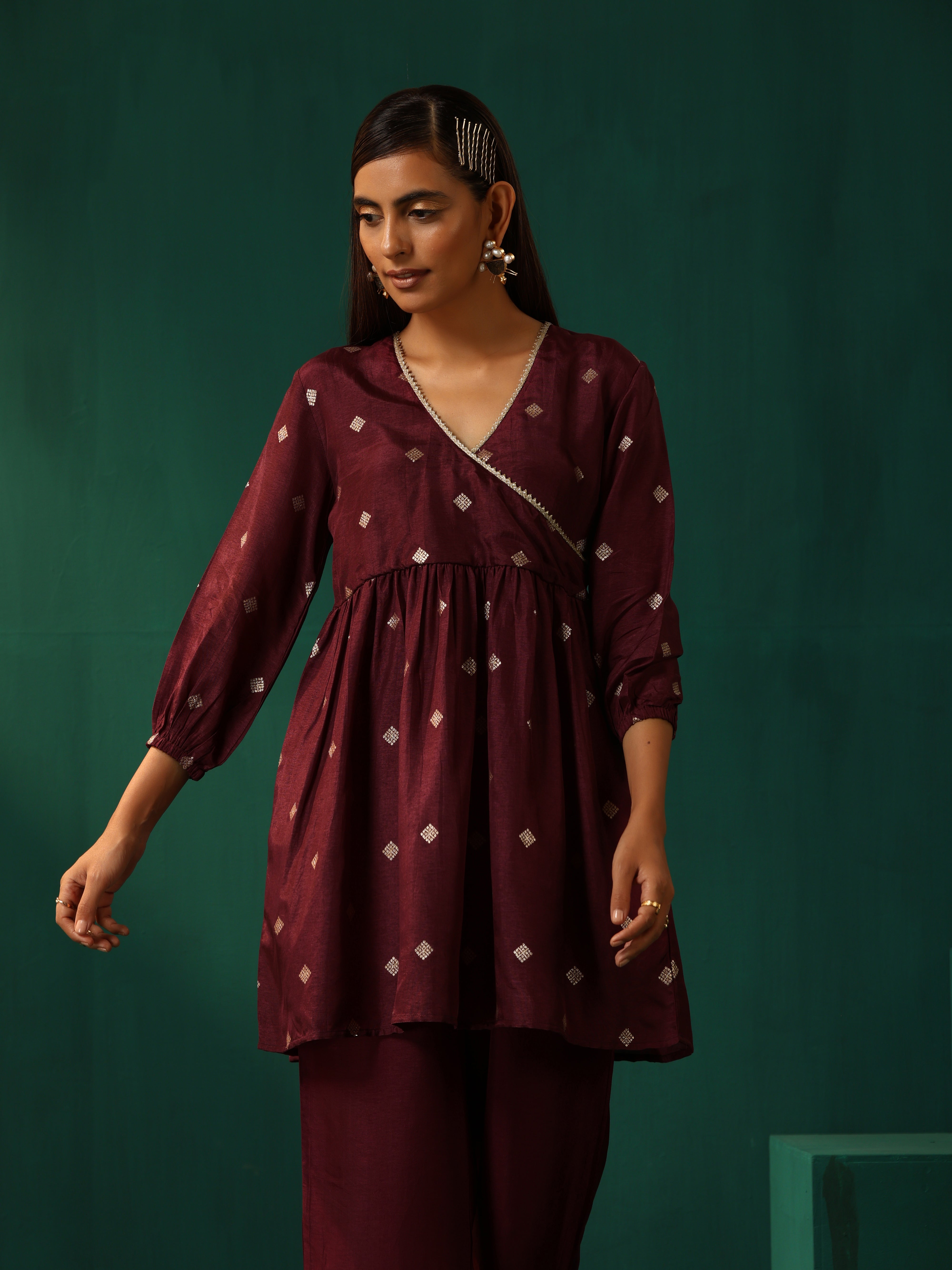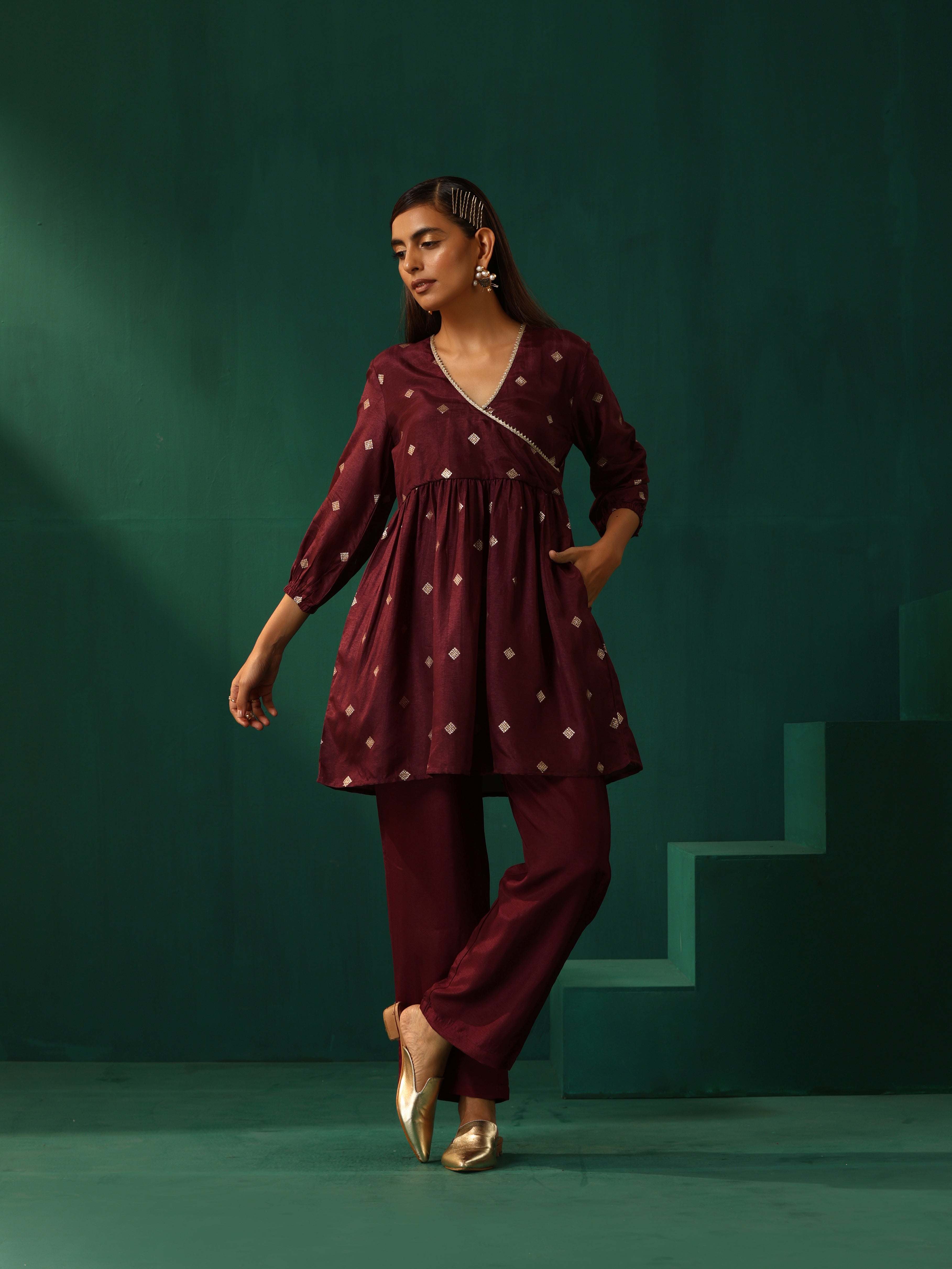 trueBrowns Wine Diamond Viscose Silk Waist Gathered Co-ord SetDescription Viscose Silk waist gathered Co-ord Set with overlap V-neck. Paired with e...