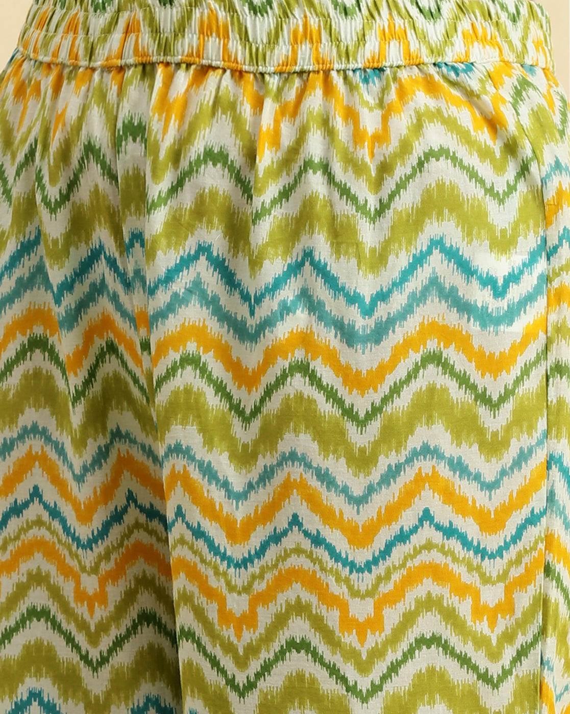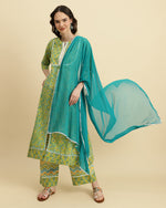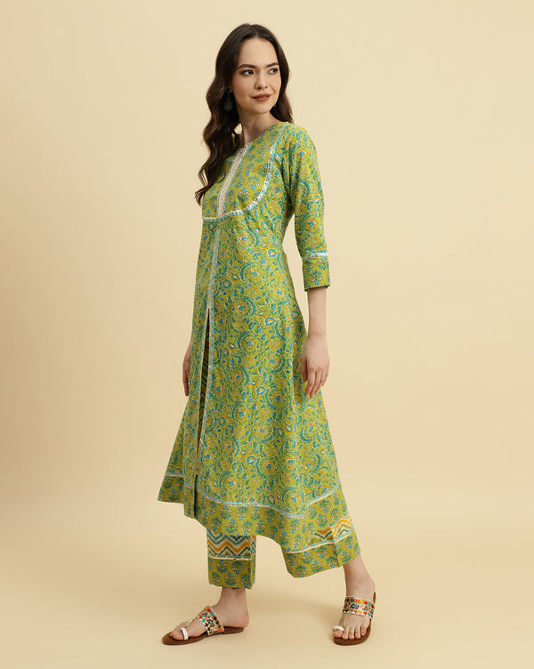green floral printed a-line kurta with yoke design and embellished with gota and mirror lace,kurta paired with palazzo and chiffon dupatta,3/4th sleeves , round neckline