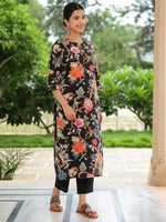 Aramya Straight Soft Cotton Floral Print Women's Kurta - Black