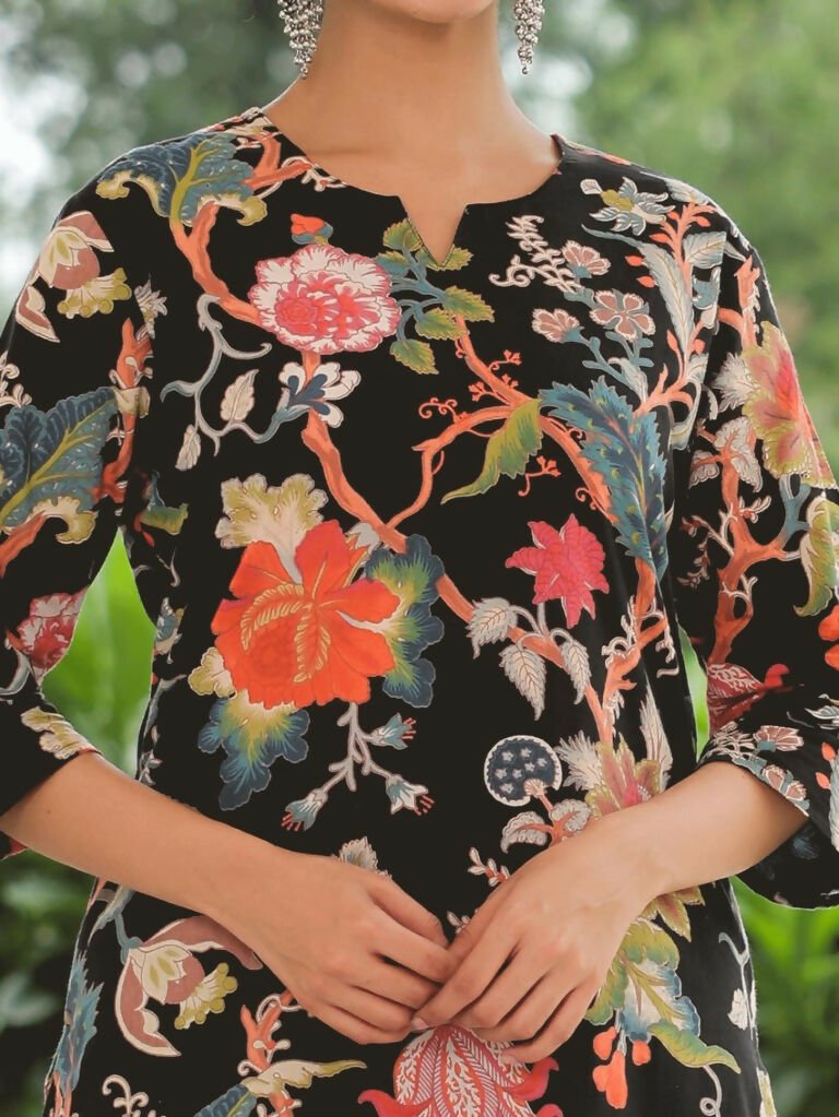 Aramya Straight Soft Cotton Floral Print Women's Kurta - BlackElevate your style with our uniquely designed kurta, perfect for daily wear or casual...