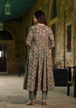 NOZ2TOZ Women's Floral Printed Knee Length Flared Rayon Kurti And Pant Set With Printed Dupatta - Green