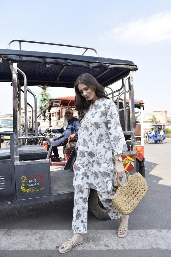 NOZ2TOZ Women's Floral Printed Knee Length V Neck Rayon Kurti And Pant Set - White - Distacart