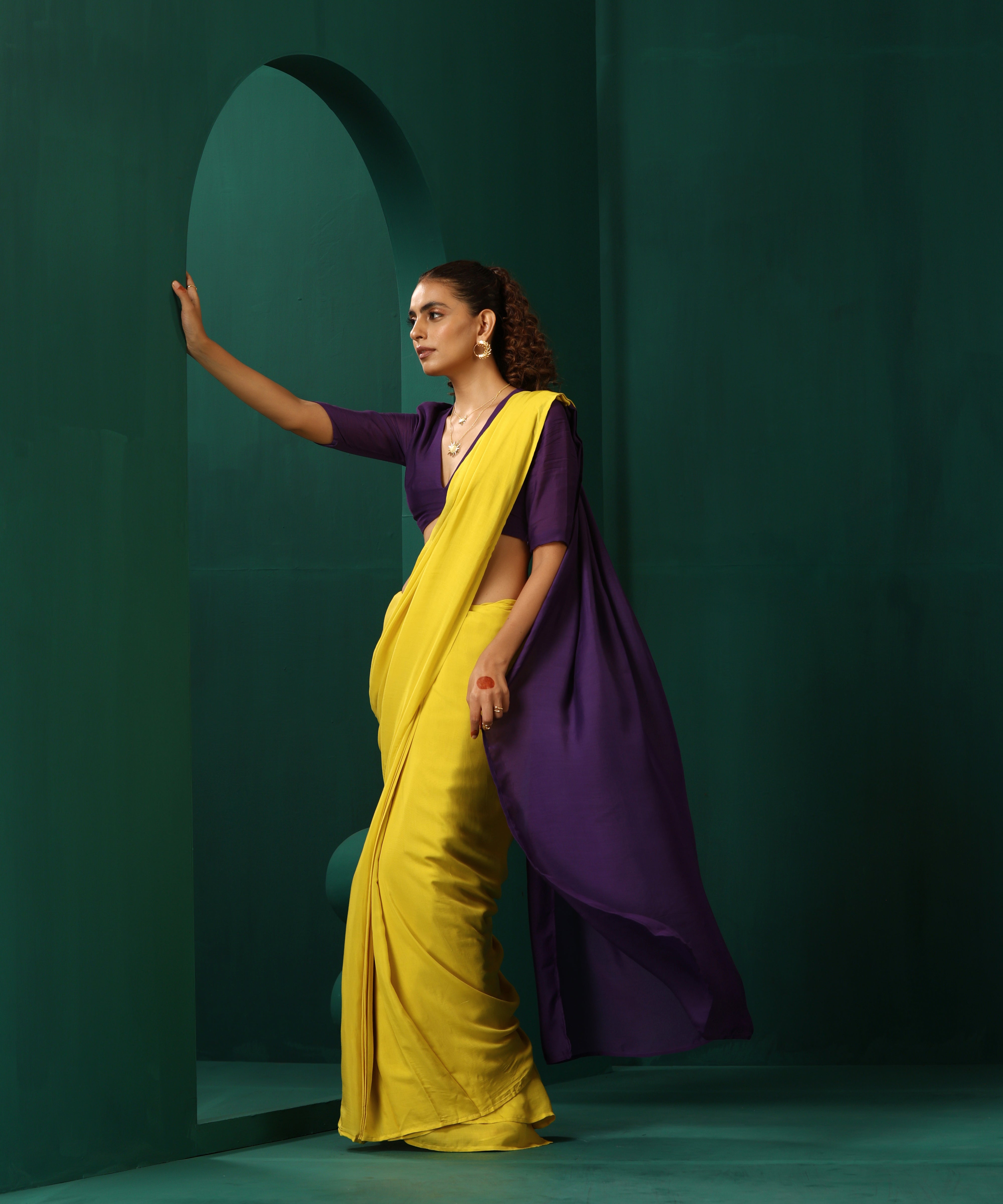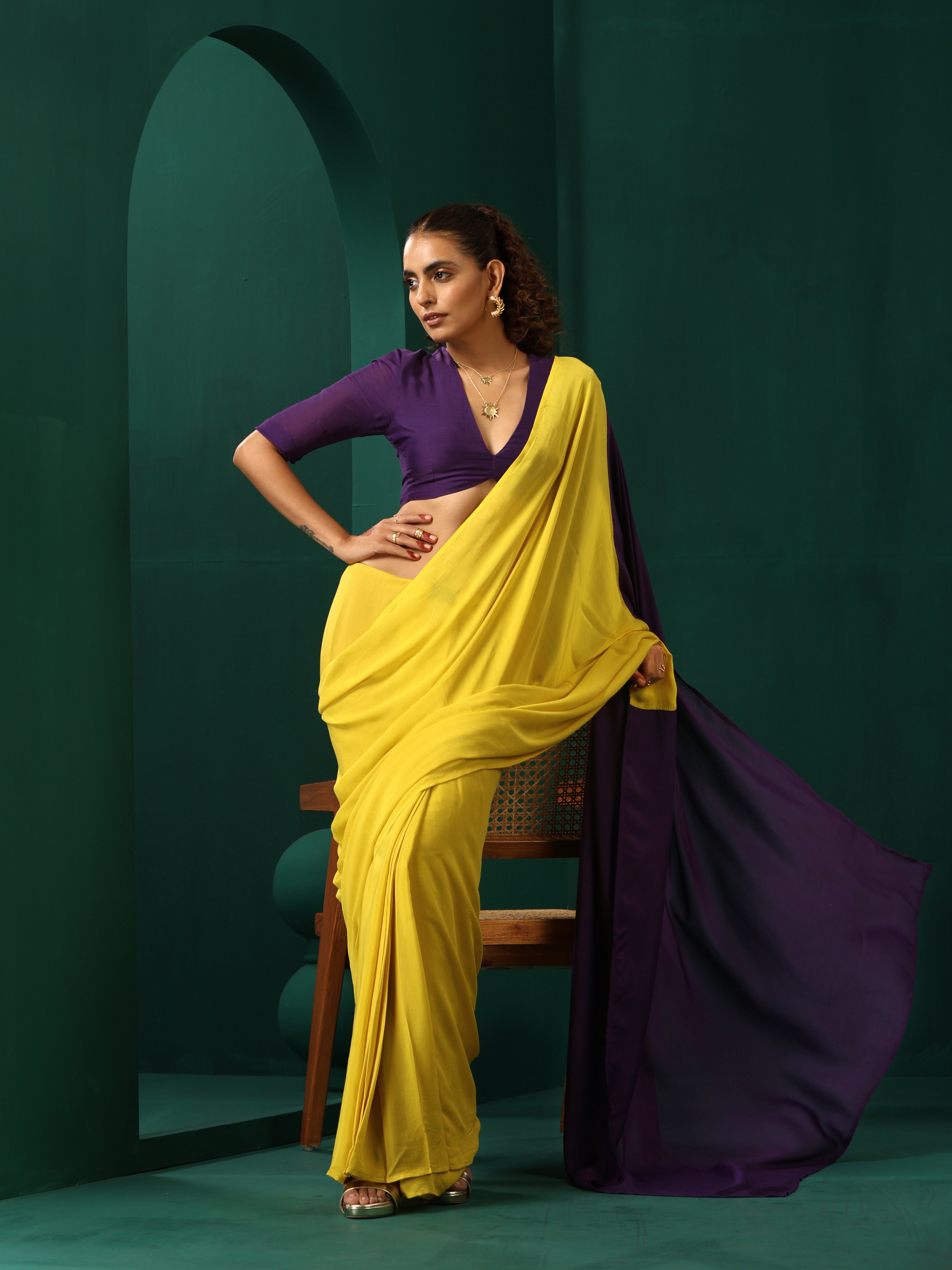 trueBrowns Yellow Purple Muslin Silk Ready to Wear SareeDescription Muslin silk color-block pre-stitched pleats saree. Style it with a blouse to co...