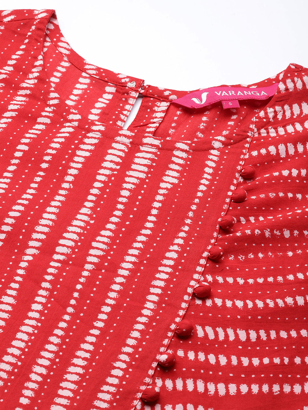 Varanga Red Printed A-Line Kurta With Three Quarter Sleeves About the product: Red printed a-line kurta with round neck, kurta has three quarter s...