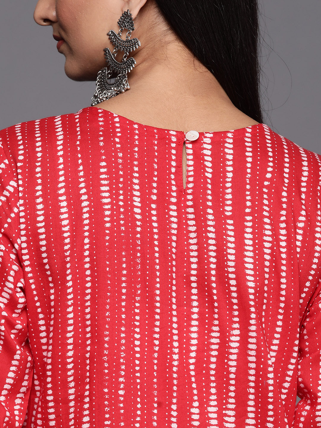 Red printed a-line kurta with round neck, kurta has three quarter sleeves, fabric buttons on yoke.