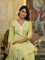 Lime Green Chikankari Embroidered V Neck Kurta, Three Quarter Sleeves With Side Slits Paired With Tonal Bottom And Chiffon Dupatta.