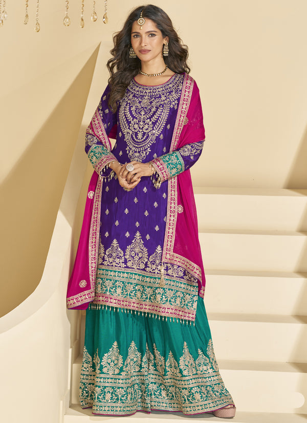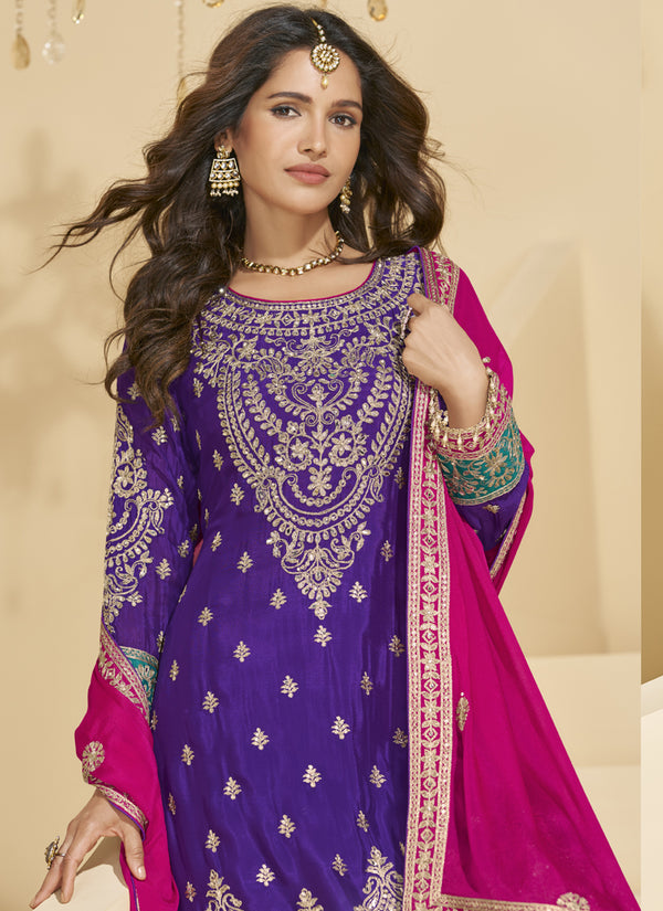 Vegaa Fashion Violet Chinon Silk Embroidered Palazzo SuitProduct Details:Wedding suit is the perfect choice for Indian festive or wedding event. Th...