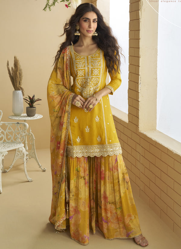 Vegaa Fashion Yellow Chinon Silk Embroidered Designer Palazzo Suit