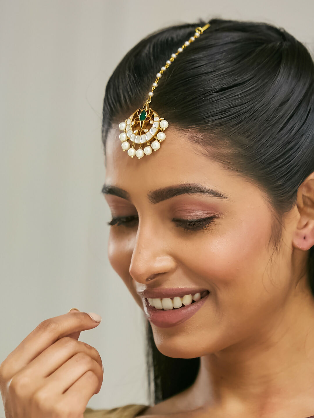 Nuyug 22K Gold-Plated Green Stone & Kundan Studded with Pearl Drop Maang Tikka Head JewelleryAbout the product:22k Gold-toned kundan maang tikk...
