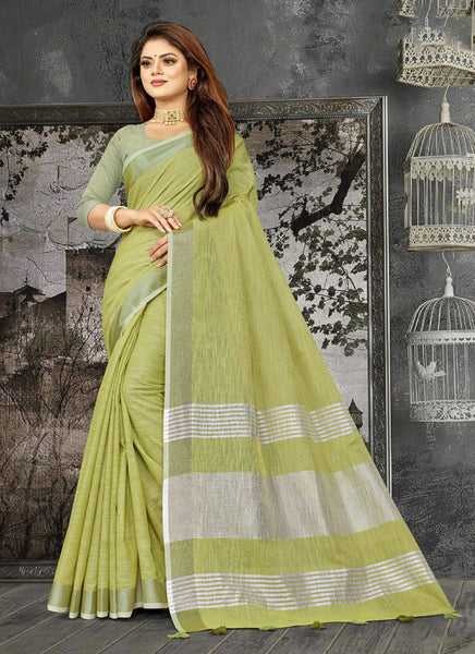 Astita Elegant Olive Green Woven Linen Saree with Contrast Zari Border & Tassels - Soft & Breathable Party Wear
