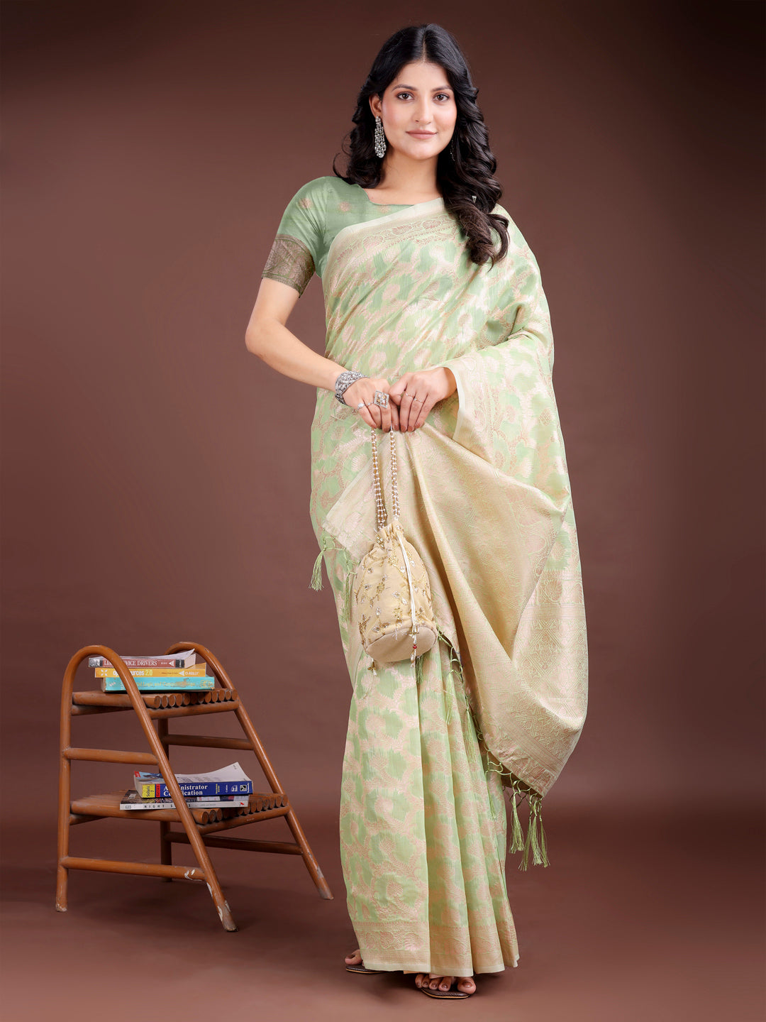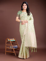 Astita Light Green Linen Cotton Woven Zari Work Traditional Tassel Saree - Distacart