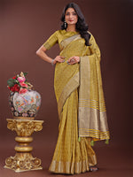 Unveil your graceful side with this timeless Mustard organza saree, featuring intricate golden zari border and pallu. Its soft, sheer fabric offers a luxurious feel with a modern appeal, ideal for weddings, festive celebrations, and parties. The striking geometric woven texture adds depth while maintaining elegance. Comes with a matching unstitched blouse piece to complete your look.Whether you're a bridesmaid, attending a puja, or heading to a formal event, this saree is the epitome of elegance and tradition with a contemporary twist.