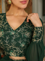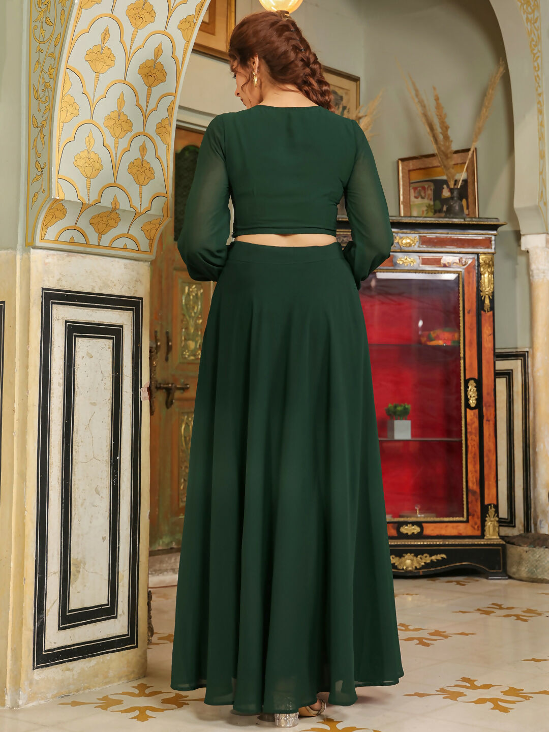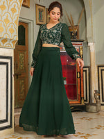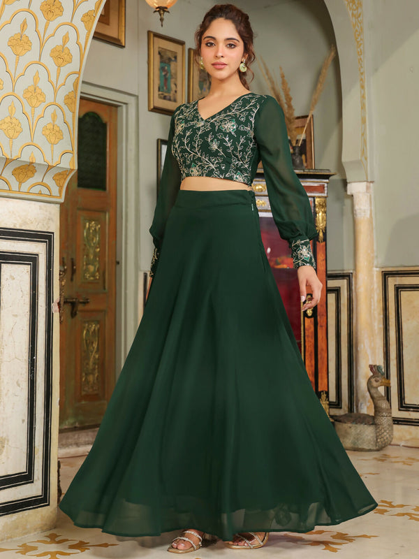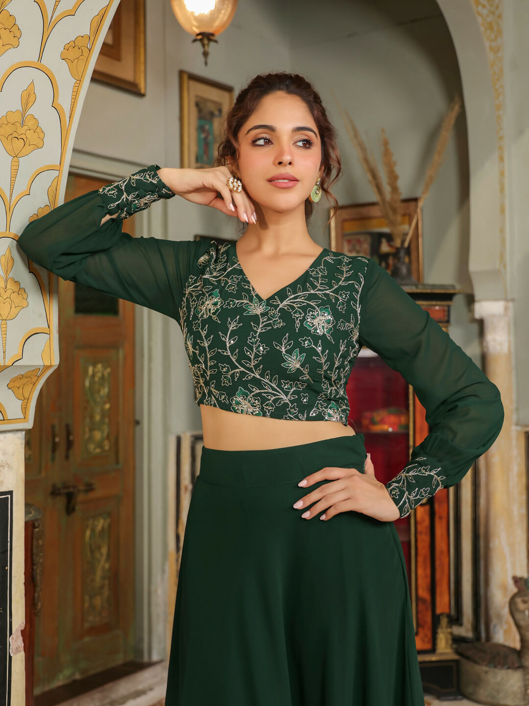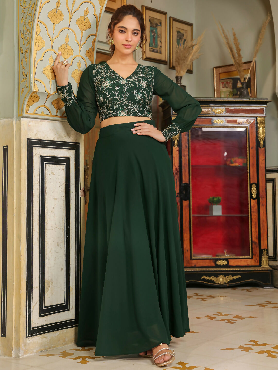 Janasya Dark Green Georgette Embroidered Top & Skirt