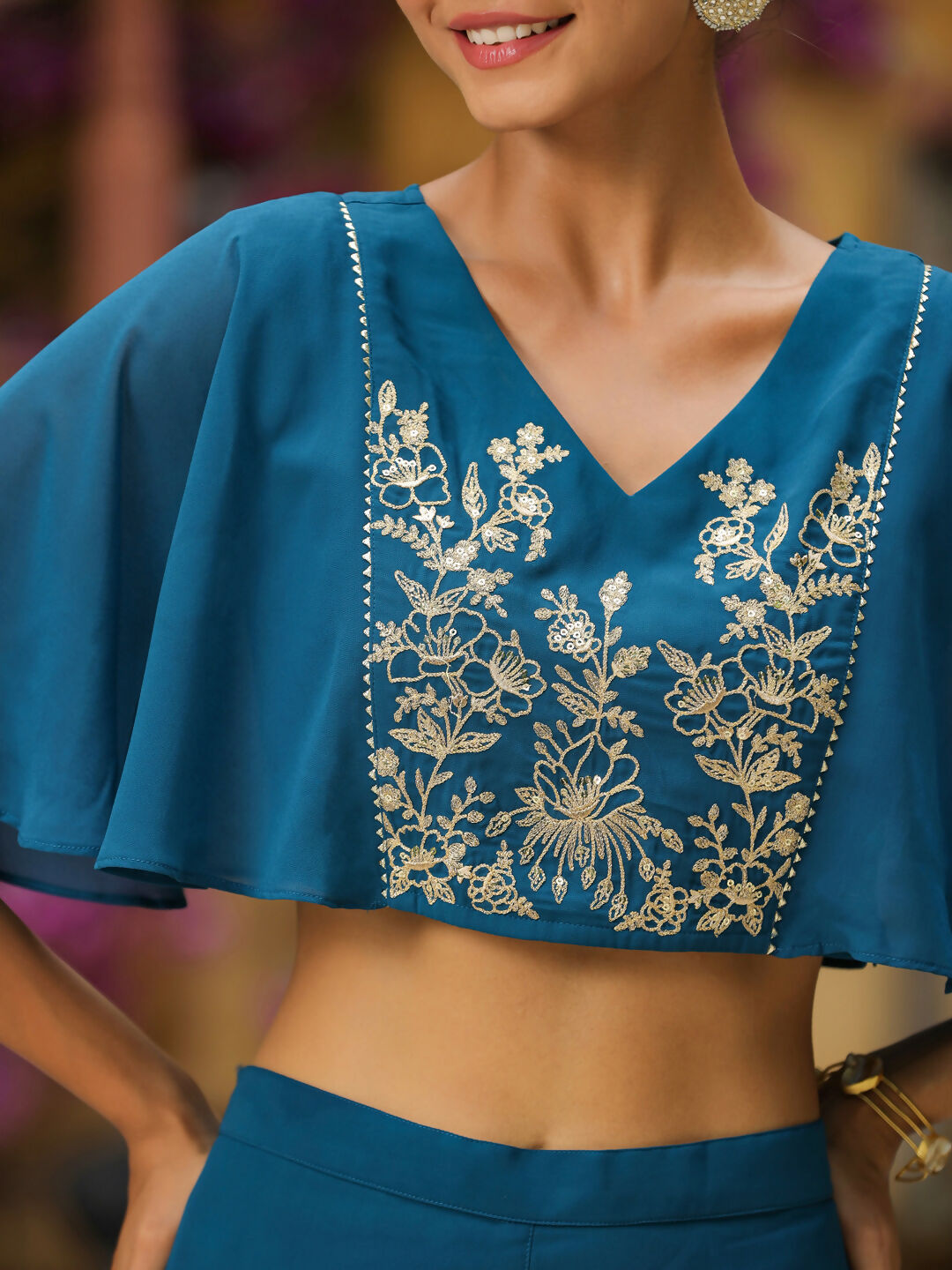 Janasya Teal Blue Georgette Yoke Embroidery Co-Ords