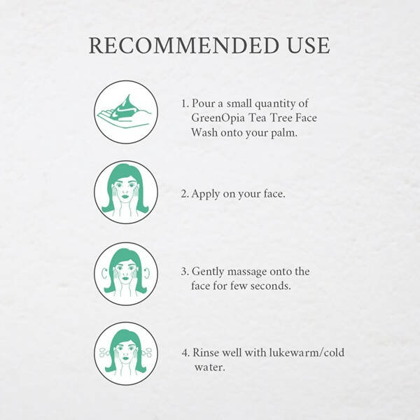 Apply a healthy portion of GreenOpia Tea Tree Face Wash and massage in a circular upward motion. Allow a few seconds before rinsing thoroughly. For best results, use regularly.