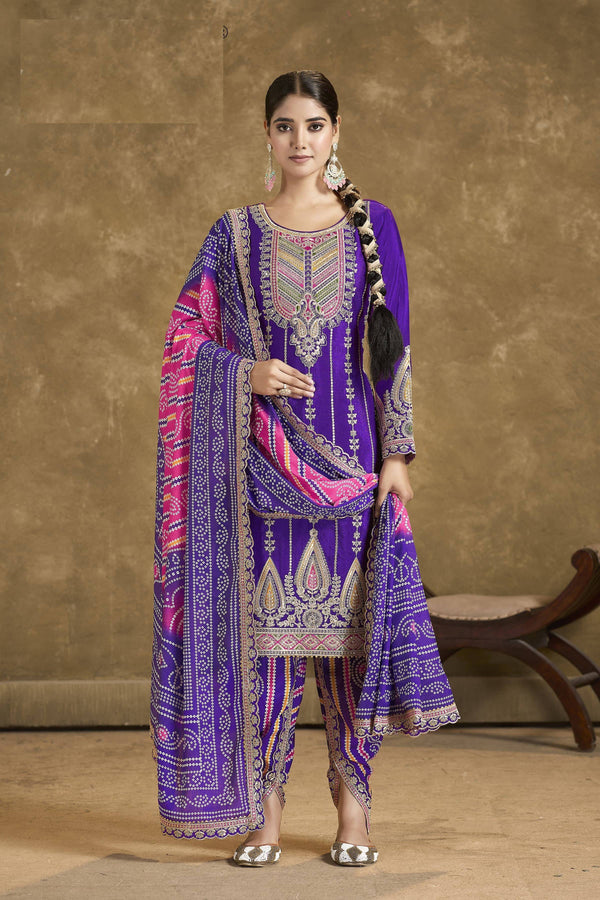 Aarshi Fashions Blue Embroidered Bandhani Dhoti Wedding SuitProduct Details Package Details : 1 Top::1 Bottom::1 Dupatta Kameez Length : 44 Colo...
