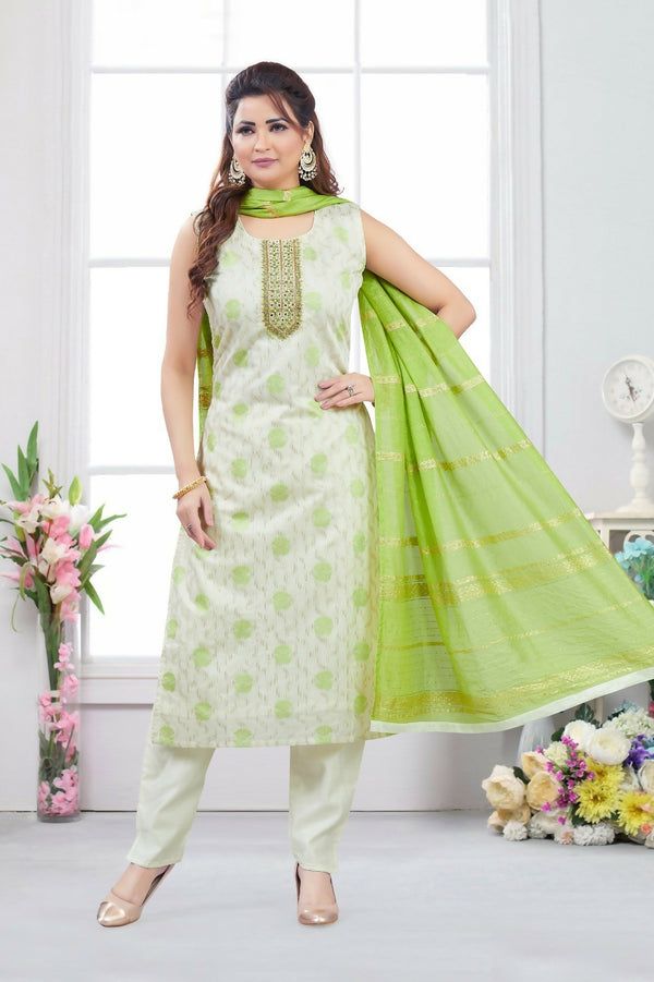 Joban Fashion Jacquard Cream Color Kurta Set Top Color : Cream Lining : Cotton Bottom Color : Cream Dupatta Color : Green No of Pieces : 3 To...