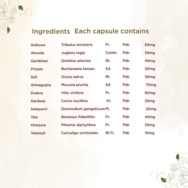 Brih-G Capsule is particularly effective in relieving pain and inflammation of muscles and joints. It contains herbs such as Goksura (Tribulus terrestris), Aksoda (Juglans regia), Gambhari (Gmelina arborea), Priyala (Buchanania lanzan), Sali (Oryza sativa), and Atmagupta (Mucuna prurita), all of which have anti-inflammatory and analgesic properties.