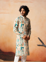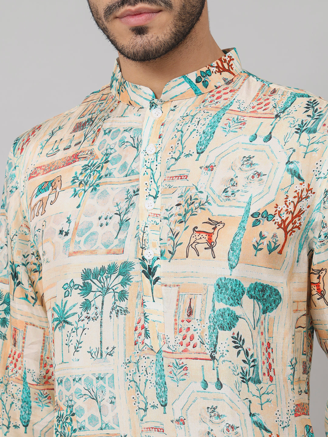Classic Forest Print Silk Kurta by Hilo DesignElevate your wardrobe with our Classic Forest Print Silk Kurta, a luxurious fusion of elegance and na...